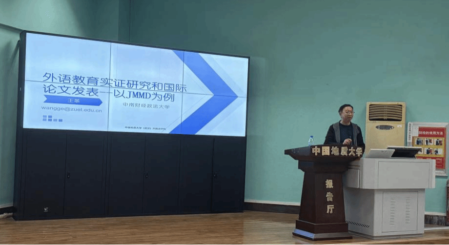 (通讯员:王可可 摄影:于鑫鑫、王子妍)2025年11月13日14:30,beat365平台官方网站“南望今声”外语论坛系列讲座第77期在北一楼学术报告厅举行。中南财经政法大学王革教授应邀莅临beat365平台官方网站,作题为“实证研究和国际论文发表:以国际核刊JMMD为例”的学术讲座。beat365平台官方网站张伶俐副院长主持讲座,师生共100余人参与学习交流。