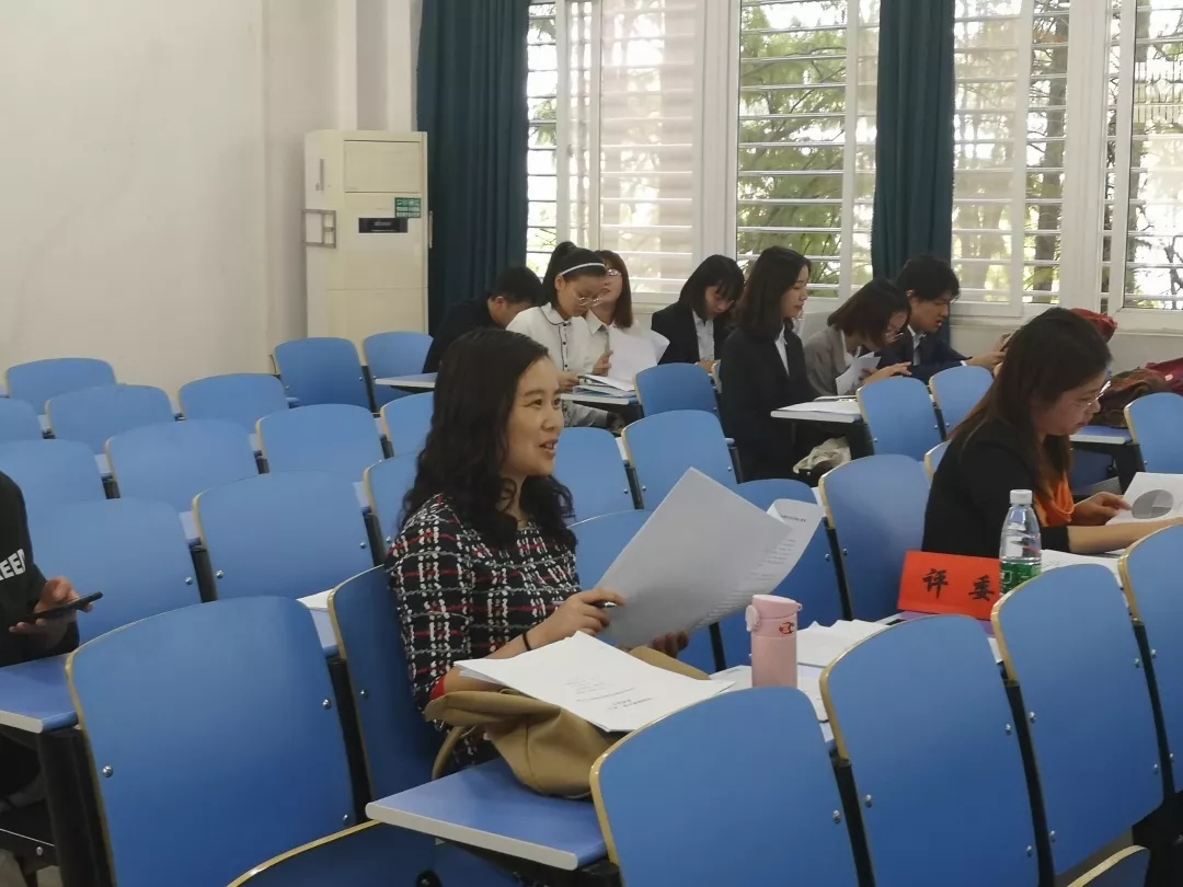 参赛团队按顺序进行答辩,其中在311会场,金艳君、樊昊、肖丽民、宋骏、黄旭星、殷梦溪分别带领团队上台答辩。与此同时在312会场,周凤洁、程娟婷、高雨果、夏倩、洪学敏、梁司颖分别带领队伍上台答辩。答辩人的精彩演讲和PPT展示涵盖了多场景汉英翻译、线上英语教育培训、中西节日文化对比、网络表情、饭圈用语等多个方面。多个团队取题新颖、条理清晰、内容明确、论证详实,受到了老师的好评。