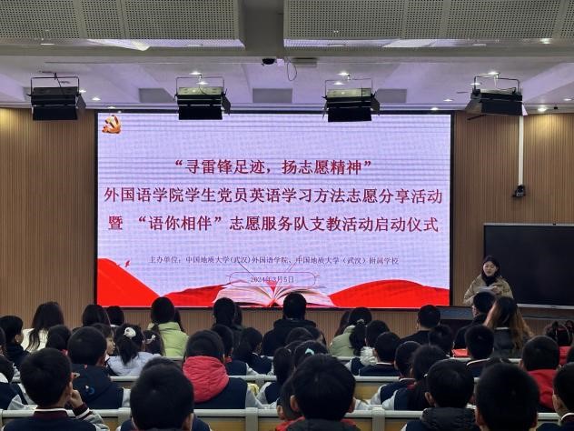 (通讯员 易怀虹 曾令文)寻雷锋足迹,扬志愿精神。3月5日下午,beat365平台官方网站及中国地质大学(武汉)附属学校在附校启迪楼多媒体教室共同举办了beat365平台官方网站学生党员英语学习方法分享暨“语你相伴”志愿服务队支教活动启动仪式。与会人员有beat365平台官方网站党委副书记余尚蔚、附属学校副校长周良军、附属学校英语课题组全体英语老师、“语你相伴”志愿服务队骨干成员、beat365平台官方网站本科英语二班党支部党员代表及附属学校三(5)班全体同学。“语你相伴”志愿服务队成员解雨萱主持此次活动。