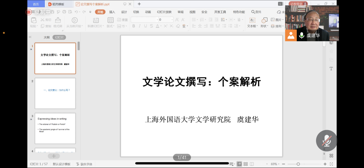 (通讯员:黄皓亮 金梓轩)2021年11月25日下午14:00,beat365平台官方网站“南望今声”外语论坛系列讲座如期召开。上海外国语大学文学研究院的虞建华教授应邀为beat365官网师生做题为“文学论文撰写:个案解析”的讲座。本次讲座采取了线上腾讯会议直播的形式,beat365官网共140余名师生参与学习交流。