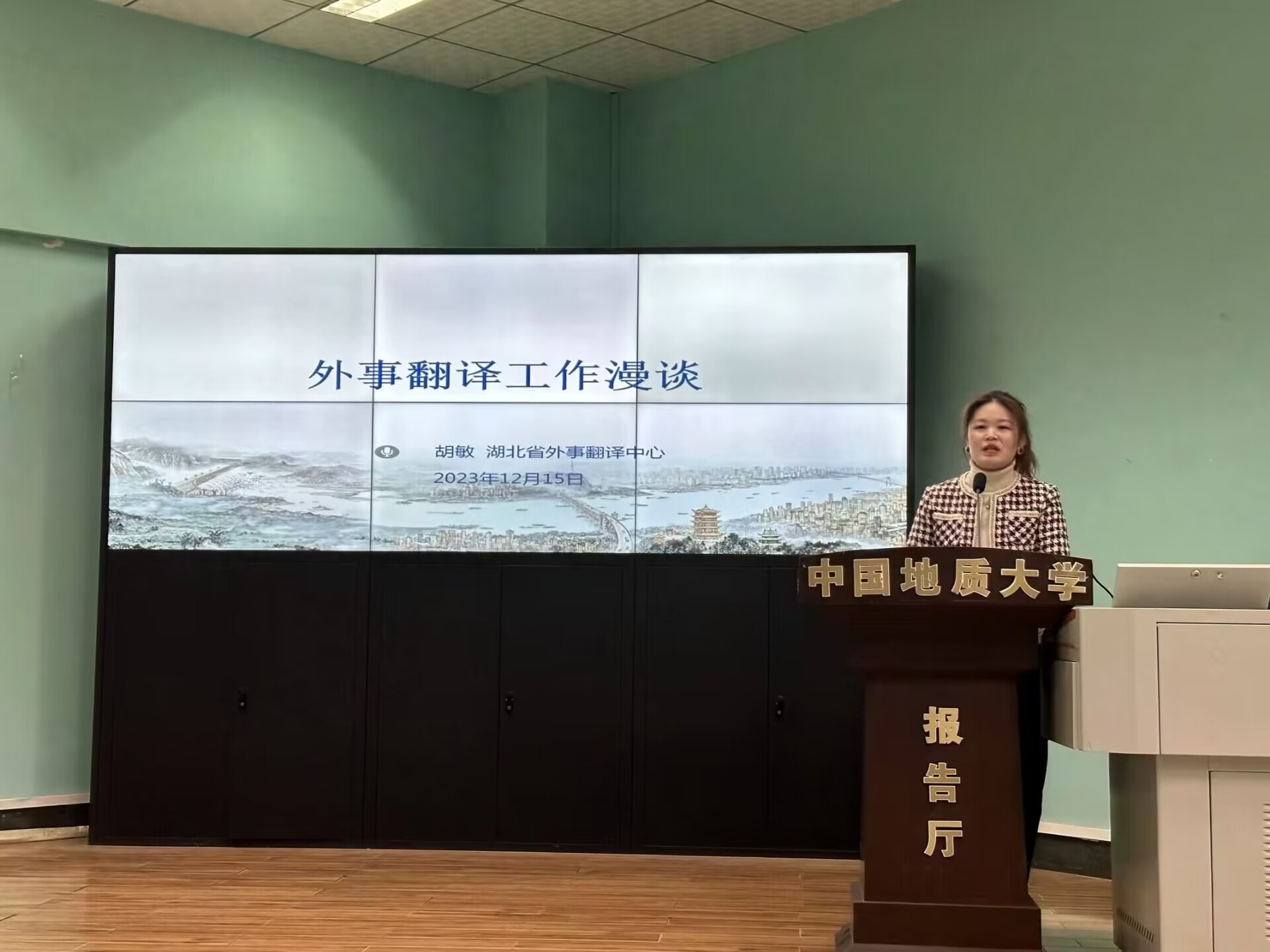 2023年12月15日上午9时00分,beat365平台官方网站“南望今声”外语论坛系列讲座第60期在北一楼120学术报告厅举行。主讲人湖北省外事翻译中心英语翻译胡敏女士,应邀开展了主题为“外事翻译工作漫谈”的精彩讲座。此次讲座由beat365平台官方网站杨红燕副教授主持,八十余名师生参会。