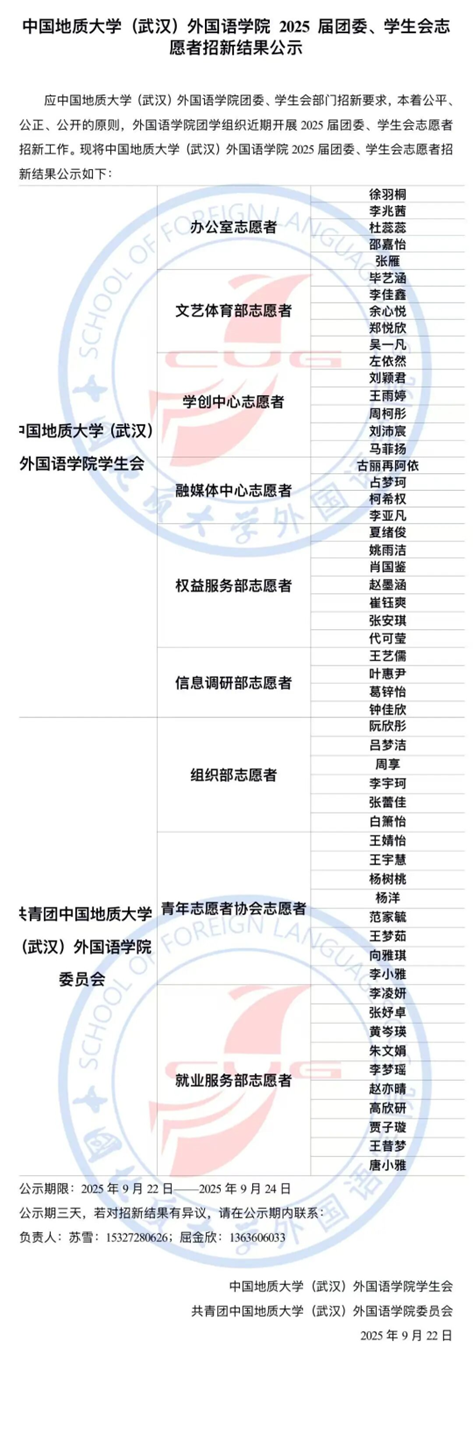 应beat365平台官方网站团委、学生会部门招新要求,本着公平、公正、公开的原则,beat365平台官方网站团学组织近期开展2025届团委、学生会志愿者招新工作,现将beat365平台官方网站 2025 届团委、学生会志愿者招新结果公示如下: