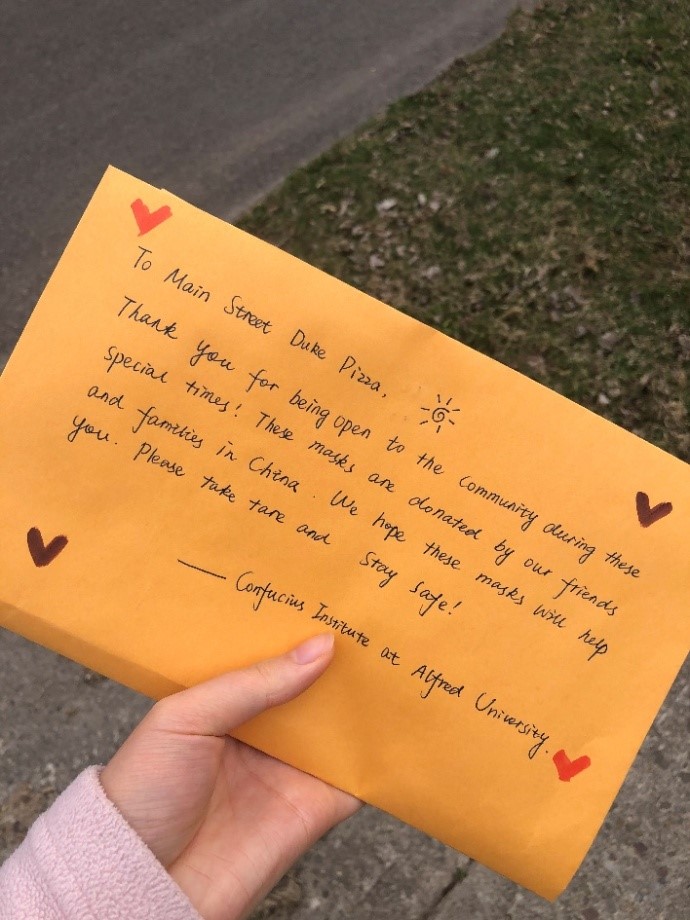 三月和四月,我们所居住的孔家变成了一个捐赠口罩的重要桥梁,我们通过邮件告诉学校还在工作的教职工和留学生,还有周边社区的居民们,如果非常需要口罩(由于工作性质,像消防队、社区医院、学校食堂等部门还在工作;有些留学生无法回国,也滞留在学校),可以邮件联系我们,我们会根据情况以及我们手头多余的口罩数量进行捐赠。我们把口罩用信封包起来在信封上写好名字,放在门口的信箱,通过邮件告诉他们取口罩的时间,这样就实现了零接触捐赠口罩。
