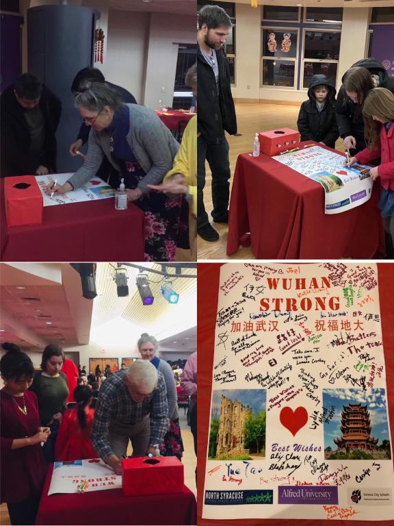 为了能够购买更多的医用物资,我们商量后决定再向阿尔弗莱德大学以及周边社区发起捐款的活动。于是我开始搜集各种资料,制作了一个“武汉加油”的视频以及一张签名海报,在一个晚会活动上,我们给来参加活动的教职工、学生和社区居民播放了视频,并向观众们介绍了武汉人们众志成城、抗击疫情的情况,讲述了地大(武汉)教职工积极努力,支持帮助近500名国际学生的生动事迹。