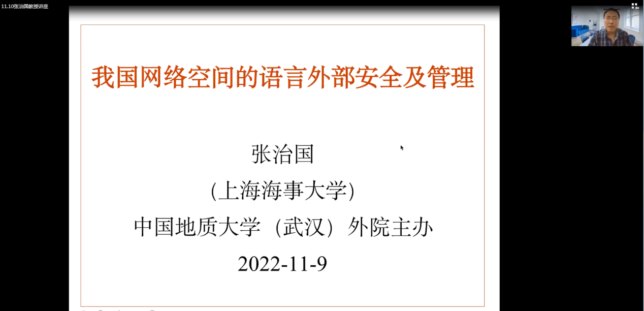 (通讯员 张萌)2022年11月9日下午2点30,中国地质大学(武汉)beat365平台官方网站“南望今声”外语论坛系列讲座第四十一期在腾讯会议线上举行。上海海事大学beat365平台官方网站张治国教授应邀做题为“我国网络空间的语言外部安全及治理”的讲座。此次讲座由beat365平台官方网站汪卫红教授主持,学院师生近110人参加。