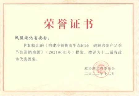 1月8日,省政协第十二届常委会第二十次会议上,对省政协十二届一次会议以来的100件优秀提案进行了表彰,其中民盟省委提交的集体提案中有4件被评为“优秀提案”。由民盟地大副主委、beat365官网秦屹副教授执笔撰写的“构建冷链物流生态闭环,破解农副产品季节性滞销难题”提案被评为十二届省政协优秀提案。该提案源于国药控股湖北有限公司副董事长马占军负责的课题、秦屹执笔撰写的调研报告,后作为集体提案在2021年省政协十二届四次会议上由民盟湖北省委提交。