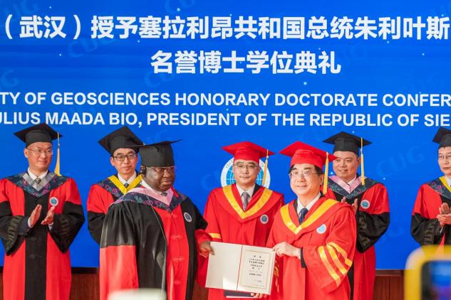 2024年3月2日下午,塞拉利昂共和国总统朱利叶斯·马达·比奥在中国地质大学(武汉)获授名誉博士学位。