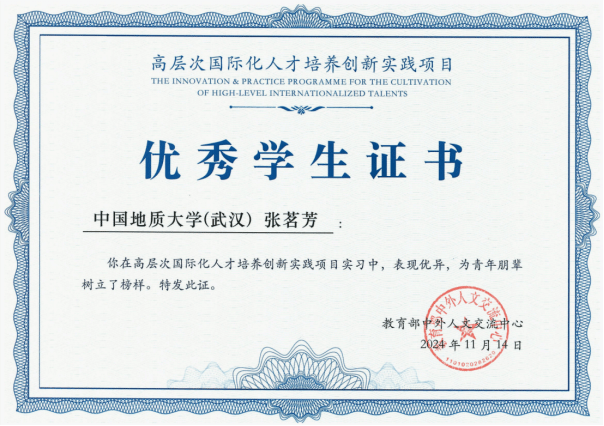 近年来,我院重视高素质国际化复合型人才的培养工作,积极推进国际胜任力人才的培养和推送,重视学生的跨文化交际能力培养,深化与国际组织的合作,拓宽学生的国际视野和实践平台。beat365官网张茗芳同学在高层次国际化人才培养项目中脱颖而出,荣获优秀学生证书,彰显了我院在国际化人才培养方面的卓越成效与不懈努力。未来,beat365官网将继续培养更多具备全球胜任力的高层次人才,为强国建设、民族复兴贡献外语人的智慧和力量。