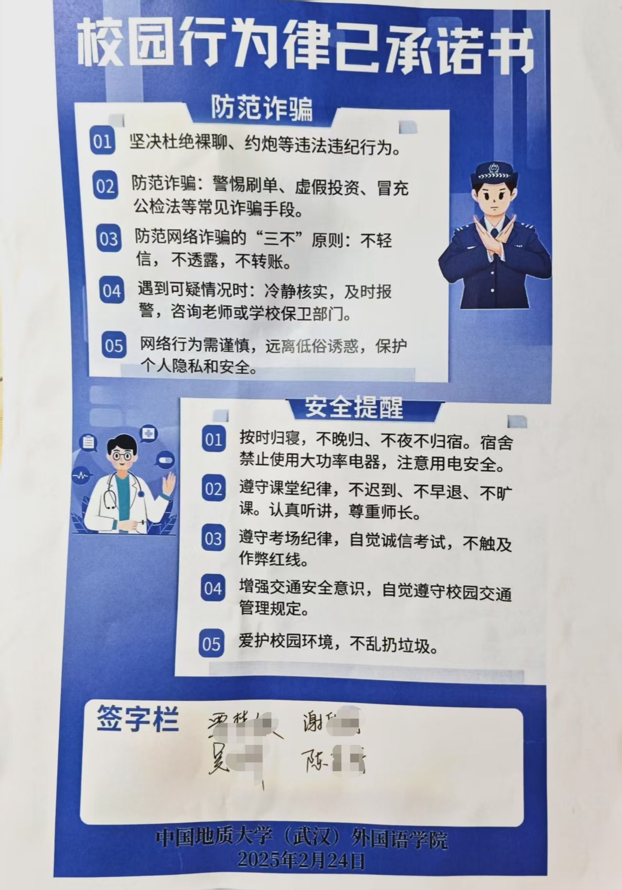 此外,学院特别制作电动车消防安全提示,以宿舍为单位开展电动车安全承诺接力活动。各宿舍集体学习电动自行车充电规范后,在提示条上签署姓名,实现安全责任“到寝到人”。