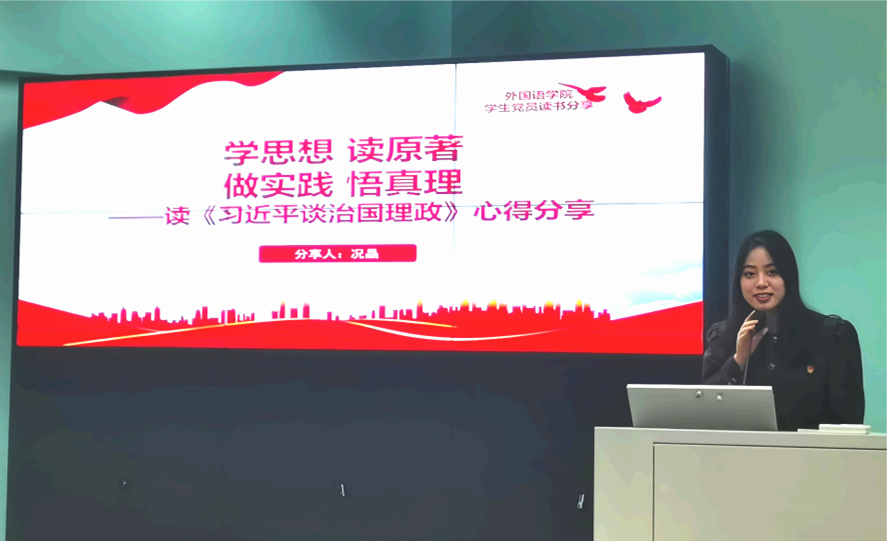 接下来,研究生党员况晶做了题为“学思想,读原著,做实践,悟真理”的读书心得分享为此次活动预热。况晶分享的是读《习近平谈治国理政》的心得体会,这本书全面系统回答了新时代中国发展的重大理论和现实问题,是国际社会了解当代中国的重要窗口、寻找中国问题答案的一把钥匙。同时,作为外语学子,况晶从双语文化的角度来领悟其中深刻内涵,她专门分享了《习近平谈治国理政》英译版本中“天下”等概念词和该书引用的古诗词在翻译过程中文化上的适应性选择。