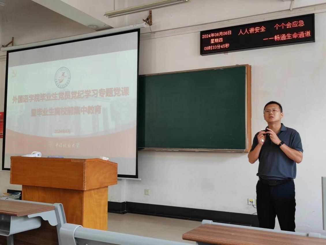 学纪在先,关键在遵守。他要求大家要原原本本学,逐章逐条学,联系实际学《条例》,要习惯在监督与约束的环境中生活,保持红线不能踩、底线要守住、高压线不能碰,严格履行党员义务,遵守党的纪律,争做合格党员。他寄语毕业生,无论何时何地都要坚持走正道、行正事、做正人!
