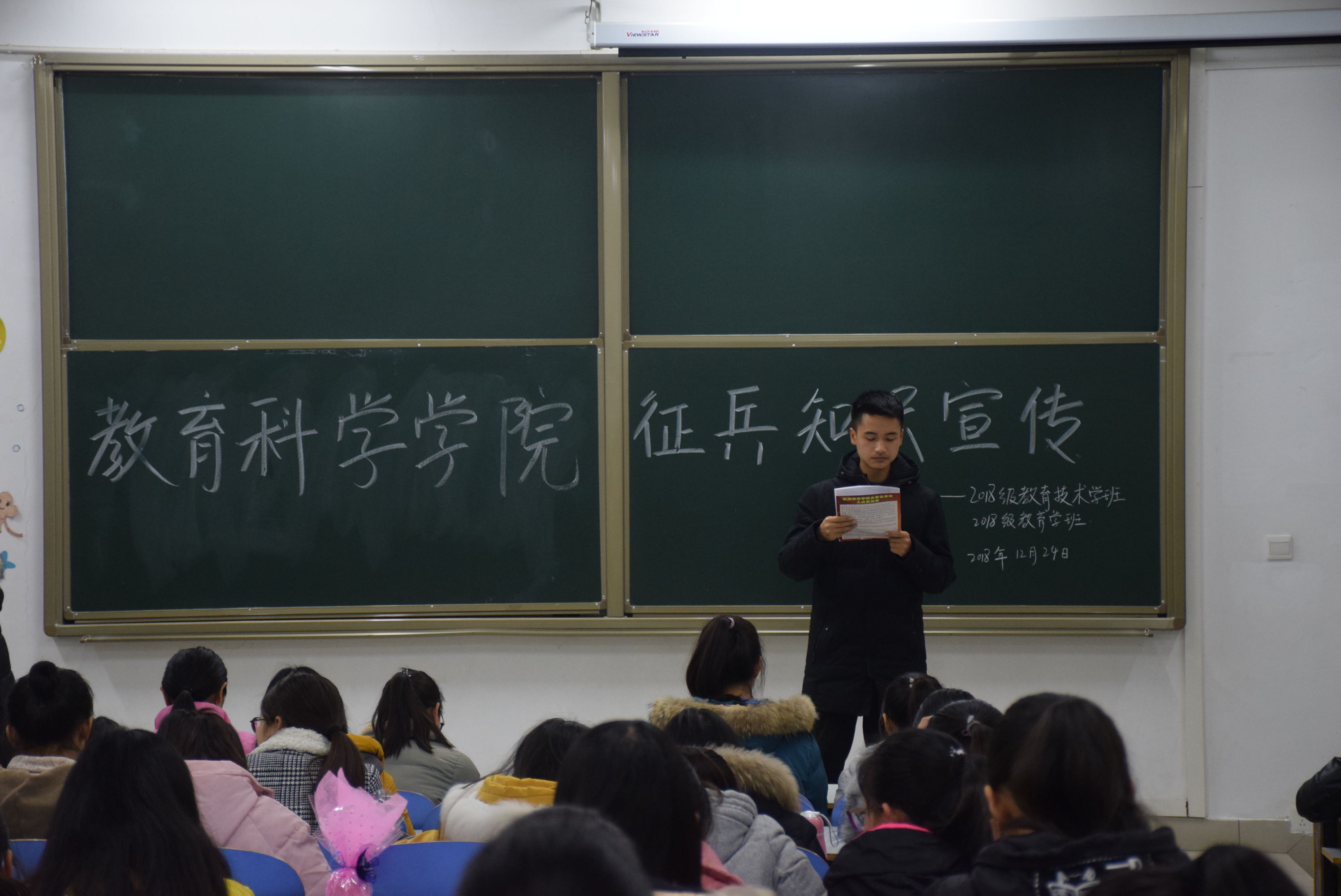 时间:2018-12-25 09:30:00 来源: 作者: 阅读: 次为配合国家征兵政策,检测大学生对国防知识的了解程度,加深同学们对征兵及国防相关知识的了解,12月24日晚,教科院学术部于教科楼108、201、204教室开展征兵知识宣传和国防知识竞赛活动。